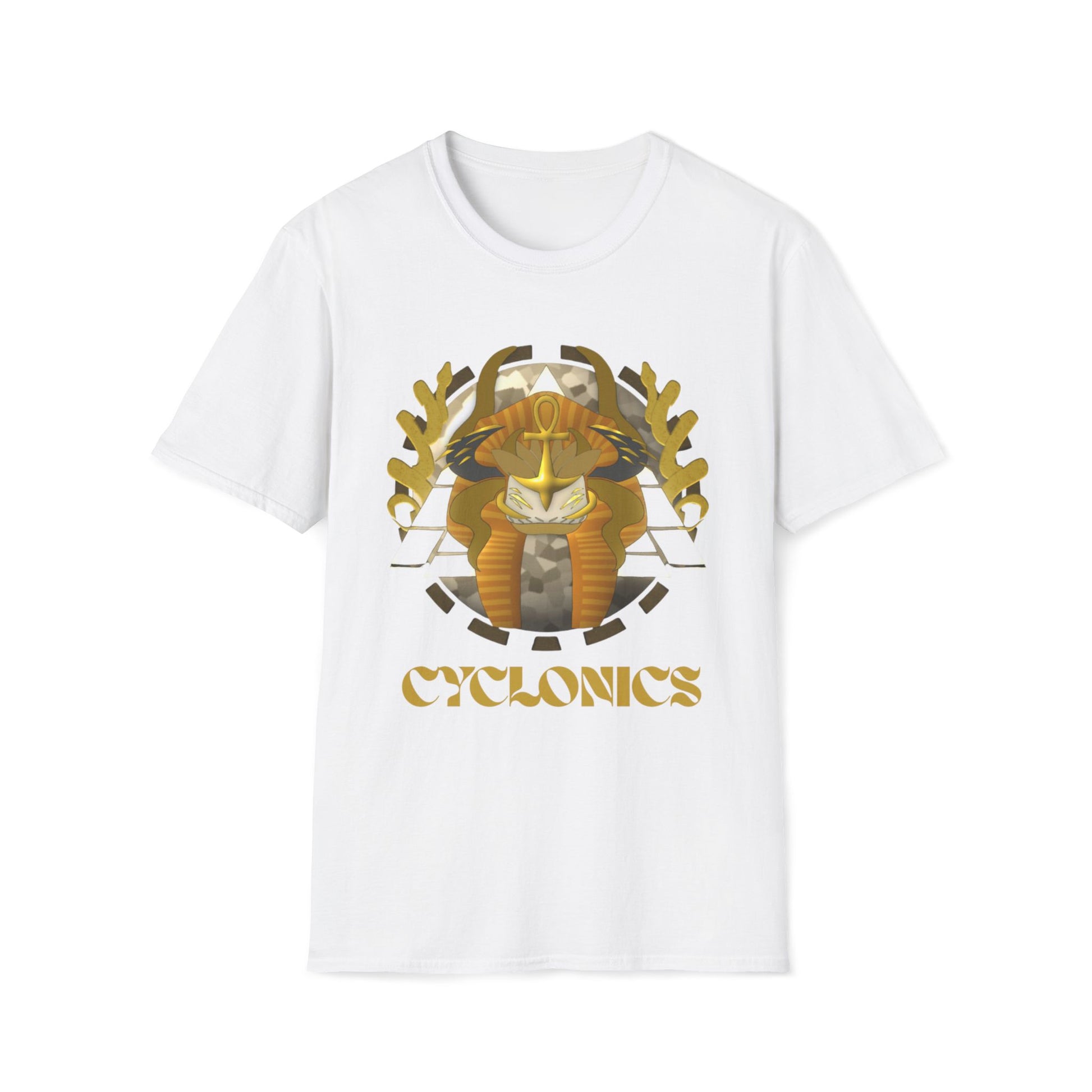 A lightweight cotton tee that feels like the shirt you reach for when you want to move freely and look measured. Warm gold and earthy tones form an abstract, heraldic motif on the front — a stylized helmet and laurel shapes framed by geometric accents and the bold wordmark “CYCLONICS.” The print sits centered on a clean white canvas, giving the design room to breathe and read like a badge or emblem. Wear it to signal quiet confidence: layered under a jacket for city nights, paired with jeans for weekend rides, or onstage for a laid-back, vintage-sport vibe.